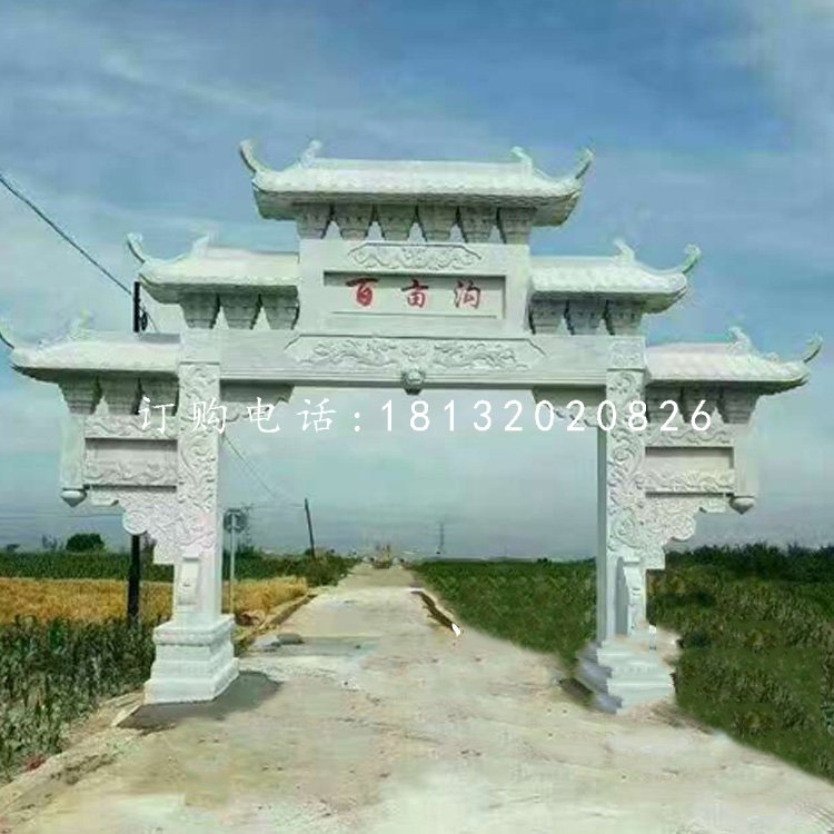 石雕牌坊按照開門數一般可分為三門、五門、七門。草白玉、青石、漢白玉以及花崗巖這些石材成為制作石雕牌坊的主要石材。牌坊周身布滿浮雕圖案,雕刻工藝精美細膩。常見的瑞獸圖案有龍、鳳、麒麟、鹿(諧祿)、魚(諧余)等。另外有荷花、牡丹、松鶴、梅蘭竹菊代表著健康長壽、平安幸福。石雕牌坊頂部的結構造型主要有坊式和樓式兩種,樓式結構的頂部結構復雜,斗拱以及樓瓦的配合使得整體氣勢恢宏。坊式結構頂部則沒有了斗拱、樓瓦這些構件,顯得簡單大方。