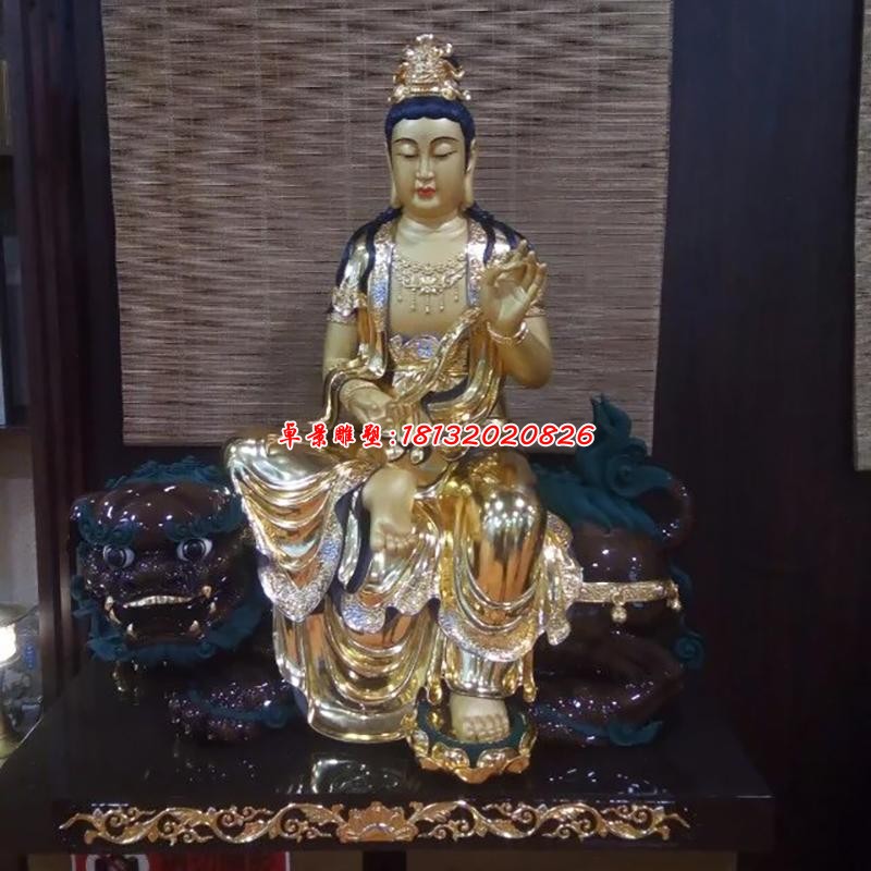 文殊是佛教四大菩薩之一,為釋迦佛的左侍者。在佛教中,普賢菩薩與文殊菩薩分別代表智與理。普賢菩薩是理之極者,而文殊菩薩則是智慧之極者大智文殊的道場在中國山西五臺山。塑像手執(zhí)金劍,坐在獅子之上,象征文殊菩薩的威嚴(yán),是智慧最高至極者,無堅(jiān)不摧,無魔不降,這也是文殊菩薩法相的意思。文殊菩薩的塑像大多非男非女較似女性。唐朝以前的不少文殊菩薩與普賢一樣,唇上常畫有蝌蚪形的小胡子,頗似美丈夫。宋代以后小胡子消失,面容更加秀麗、腰肢窈窕,又趨于中國美婦人模樣。頭上有髻,每一髻俱作童子狀,有一髻文殊、五髻文殊、八髻文殊等。文殊的坐騎是頭青獅,表示智慧威猛手持寶劍表示智慧銳利。